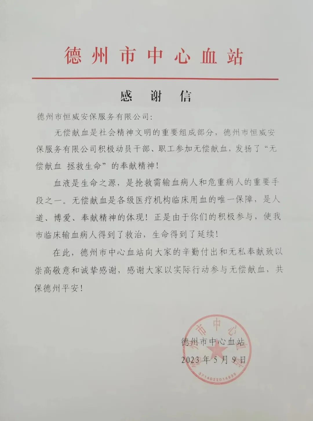 5月9日,德州市恒威安保服務有限公司組織開展“獻出一份血,傳遞一份愛”無償獻血活動,以實際行動支持無償獻血活動。