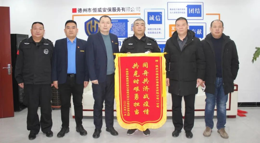 1月17日,中國郵政集團有限公司德州市分公司徐峰主任一行到訪德州市恒威安保服務(wù)有限公司并贈送錦旗,贊揚恒威安保駐郵政集團德州分公司班組履職盡責、踏實認真、勇于擔當,特別是在疫情期間安保人員24小時堅守工作崗位,嚴格防疫,切實為我公司安全有序運轉(zhuǎn)提供了有力的安全保障,對恒威安保人所做出的努力及無私奉獻、敬業(yè)忘我的出色表現(xiàn)表示充分肯定和衷心感謝。