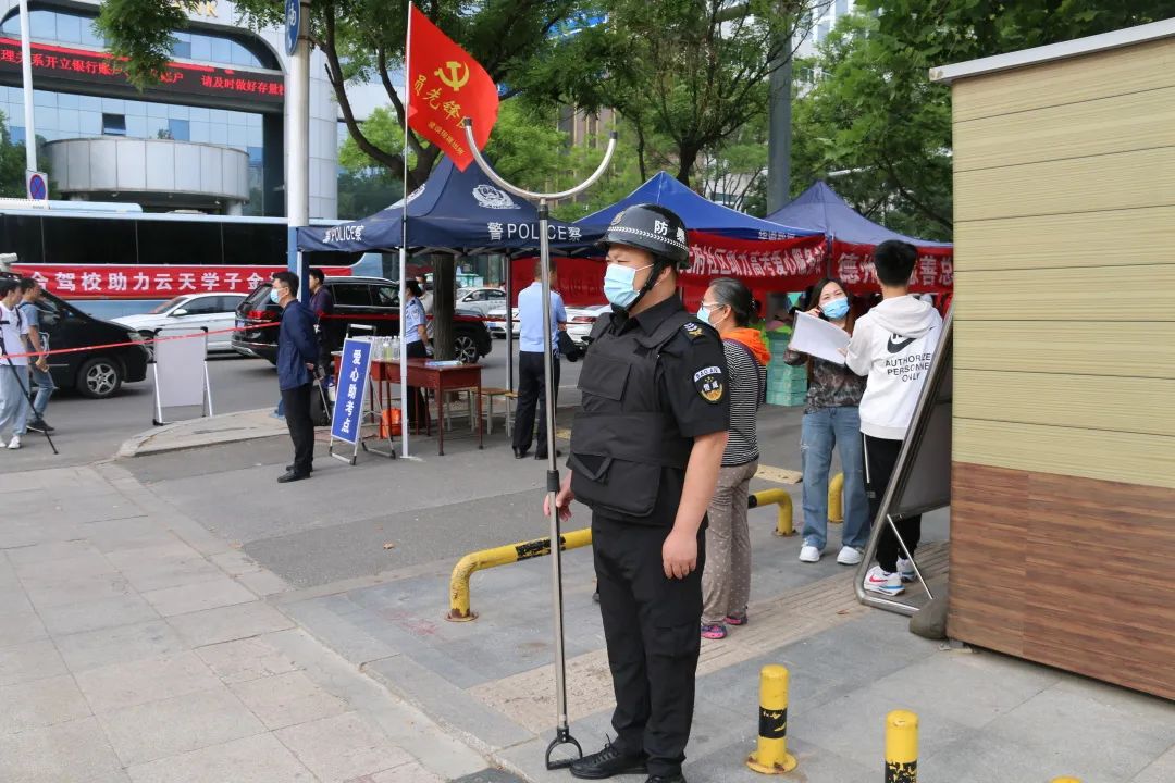 7:40,保安員積較協助公安機關在考場外劃設安全區域,拉設安全警戒帶,現場疏導群眾、讓考生順暢、安全入場。隊員們各司其職、履職盡責,考點學子有序進入,校門口秩序井然。