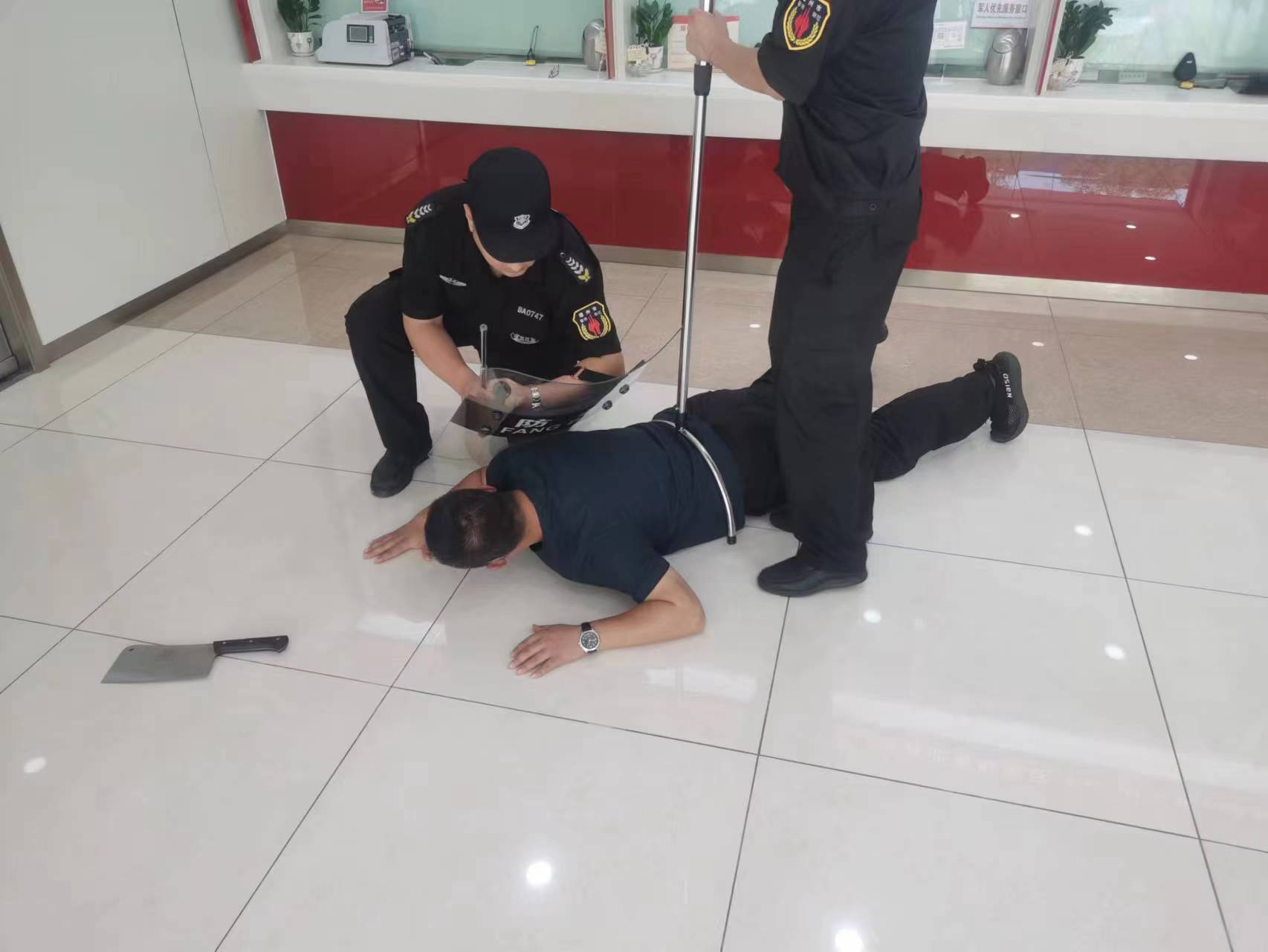 演練開始,“歹徒”攜帶刀具沖進(jìn)營業(yè)廳企圖傷人,危害客戶與銀行工作人員人身安全,面對(duì)“歹徒”威脅,保安隊(duì)員沉著冷靜勸說“歹徒”,同時(shí)組織安保人員對(duì)其攔截,有序疏散人員并及時(shí)報(bào)警,最終在保安與工作人員的緊密配合下將“歹徒”成功控制,保證了人員和財(cái)物的安全。