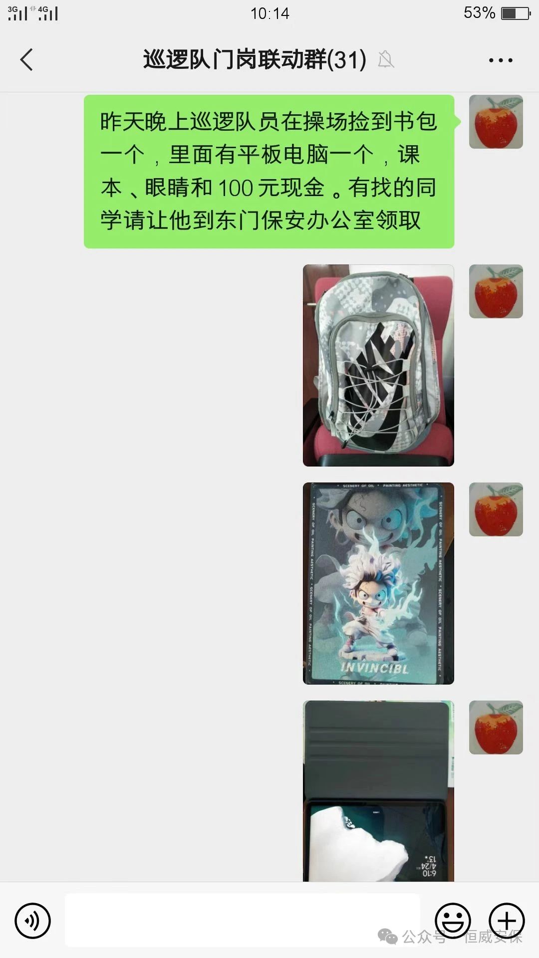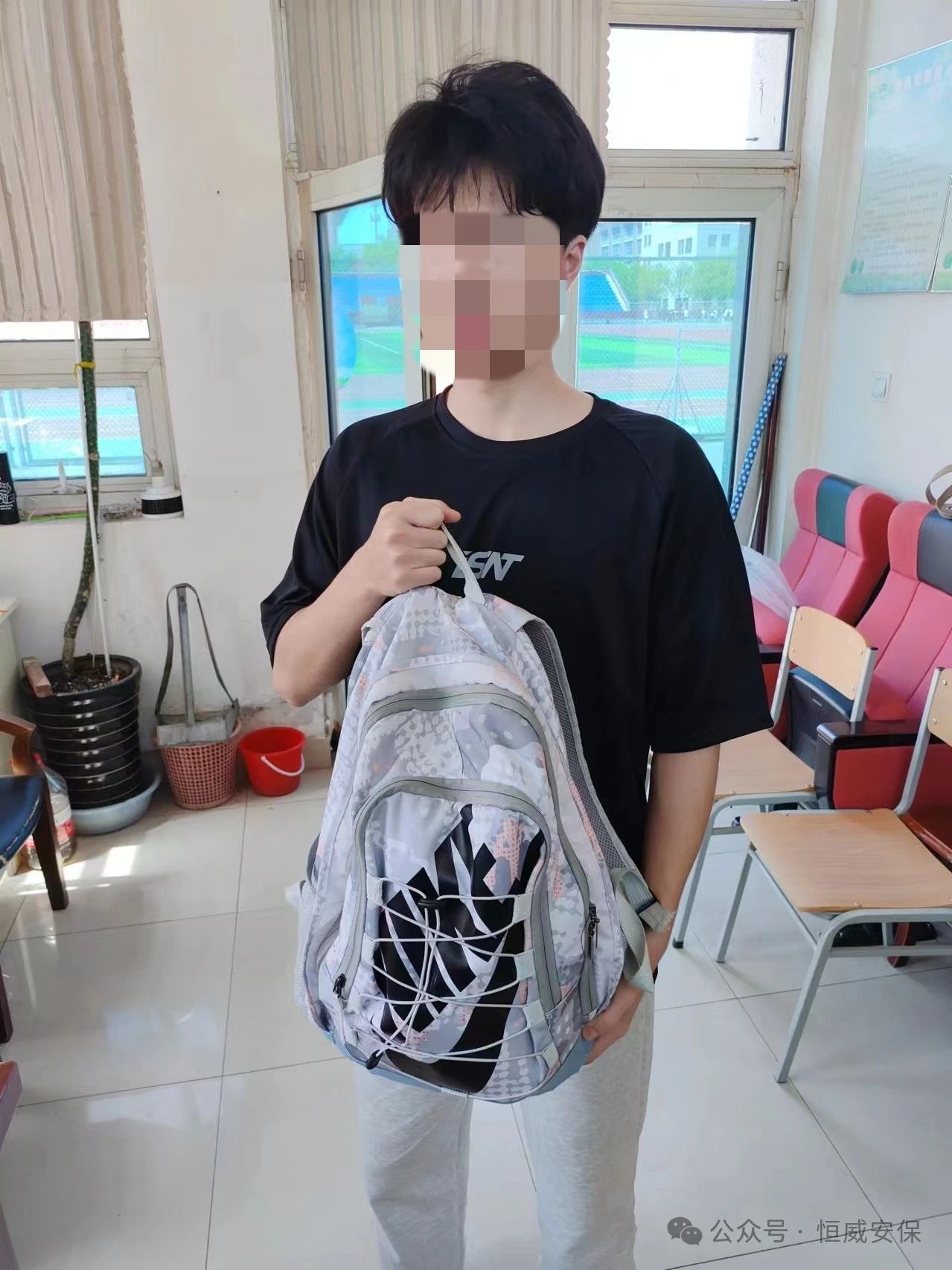 4月24日晚20時左右,恒威安保駐德州學院執勤班隊員王順元,在學校操場巡邏時,發現操場邊遺落一背包。詢問周邊人員,均不是失主。經查看背包里面有一個平板電腦、眼鏡等物品,無法與失主直接取得聯系,隨即將背包帶回值班室,并在微信工作群中發布失物招領信息。第二天上午,失主陳同學得知消息后來到值班室認領背包,值班人員經核實確認后將背包歸還陳同學。陳同學激動地表示,“太感謝王師傅了,昨天發現背包丟了,擔心了一晚上,今早晨得知保安師傅撿到了背包,一大早就來到值班室領取,包里物品完好無損,真是太感動了!”