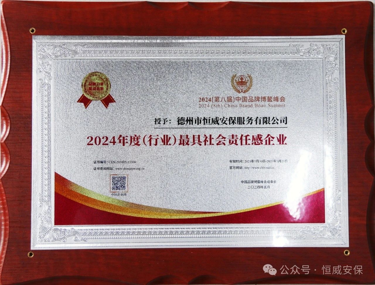 會上,經過中國品牌峰會組委會的嚴格篩選,德州市恒威安保服務有限公司憑借其卓越的服務質量和深厚的社會責任感,榮獲“2024年度(行業)最具社會責任感企業”稱號。這是對恒威安保在公共安全領域的卓越貢獻和持續的社會責任實踐方面所取得成績的高度肯定,也是對其未來發展的熱切期待。