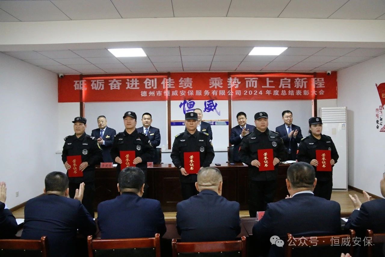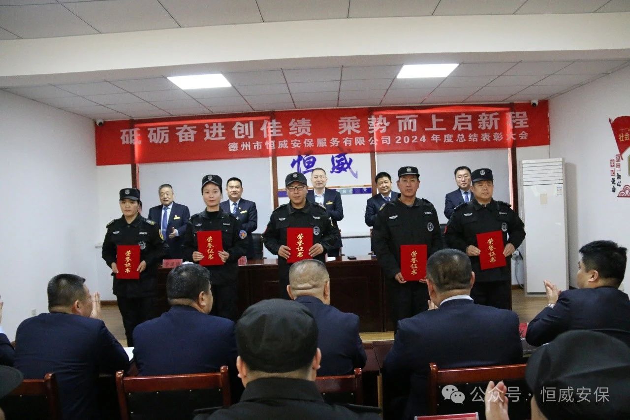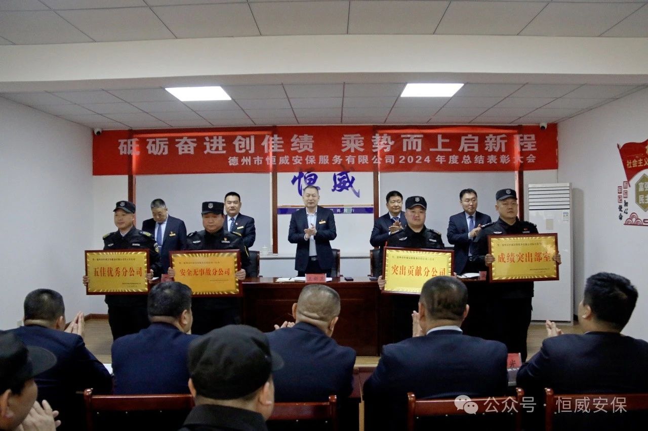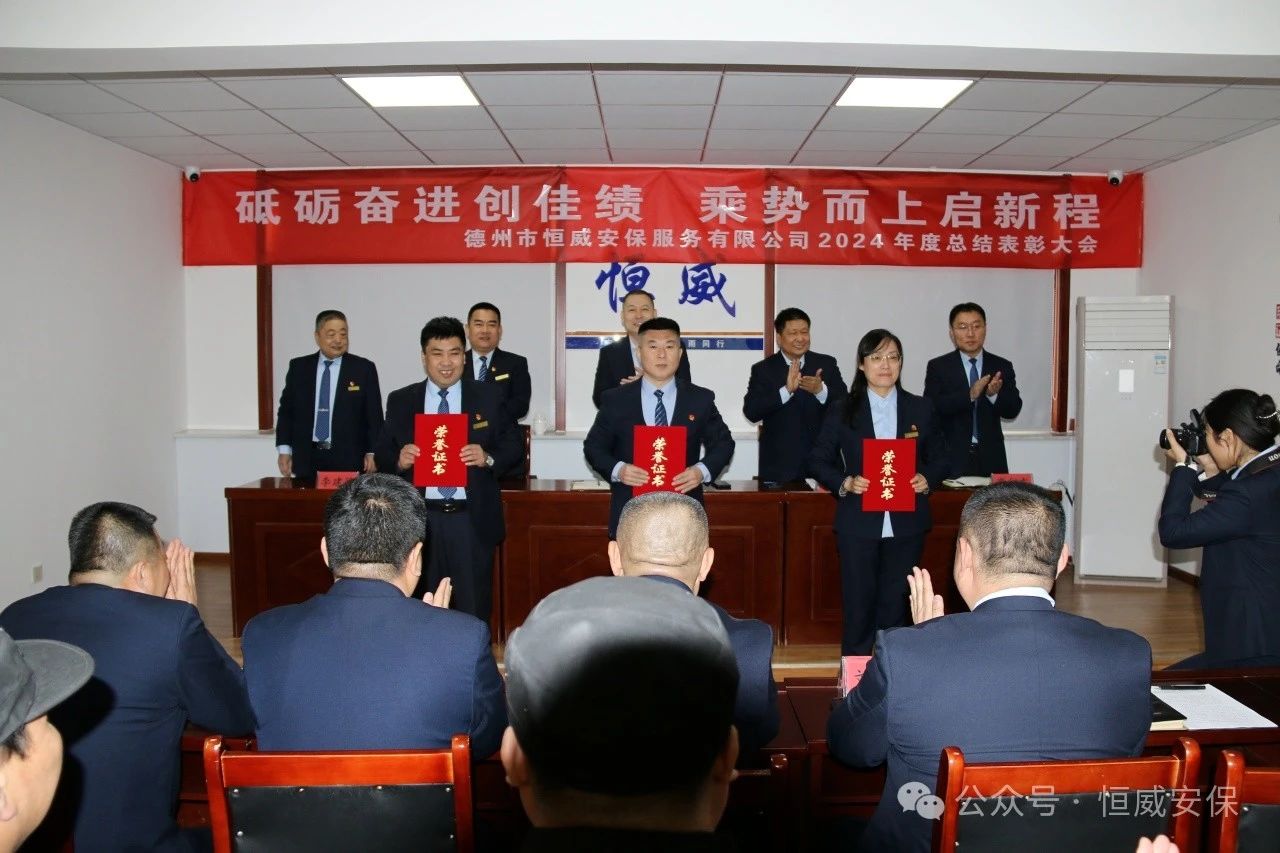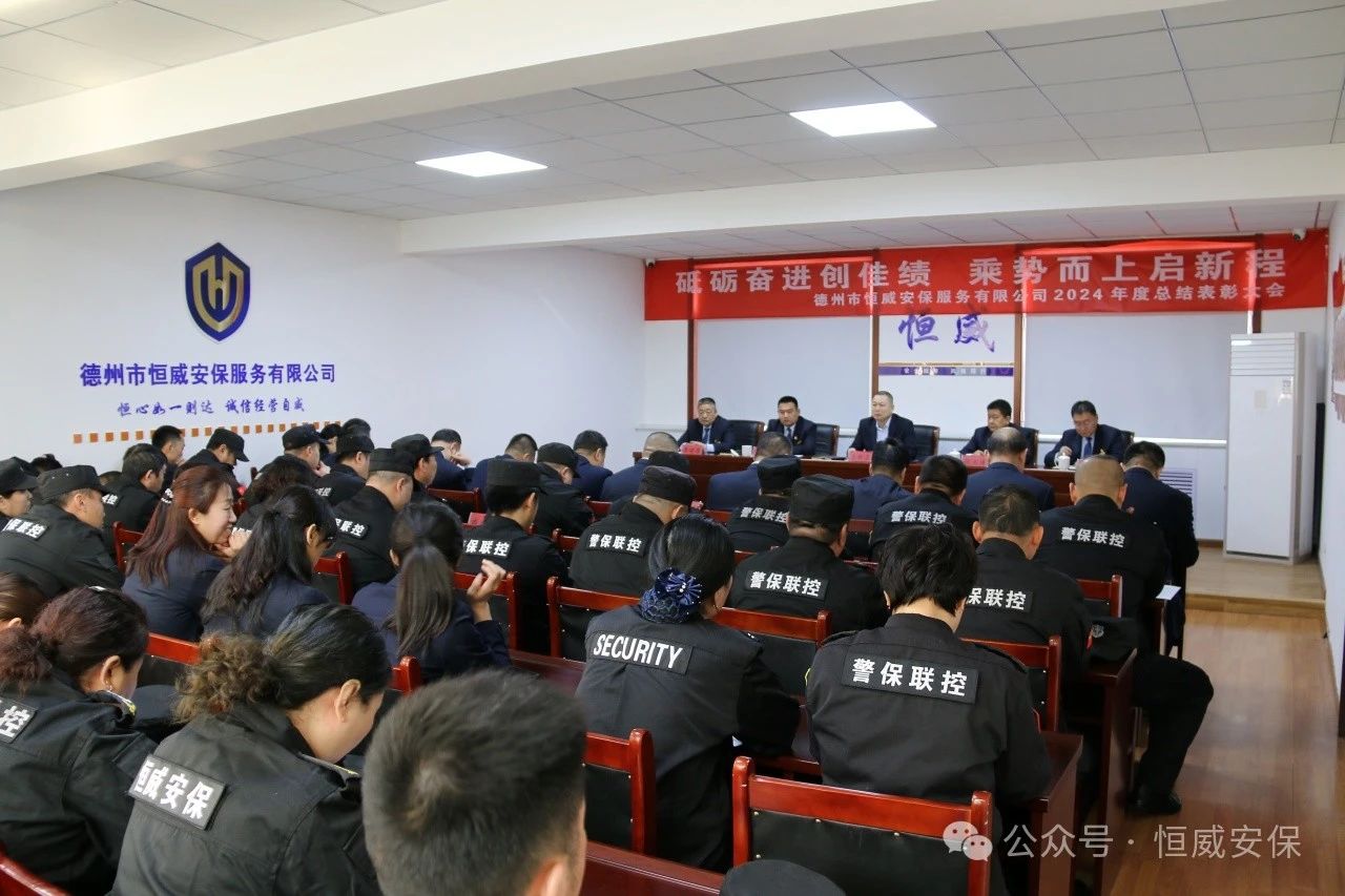 為表彰先進、激勵斗志,總結成績、展望未來,2025年2月19日上午,德州市恒威安保服務有限公司召開2024年度總結表彰大會,公司領導、各級管理人員以及獲得表彰的先進集體代表、優(yōu)秀管理者、優(yōu)秀班長、優(yōu)秀員工代表共60余人參加大會,會議由公司副總經(jīng)理張玉濤主持。
