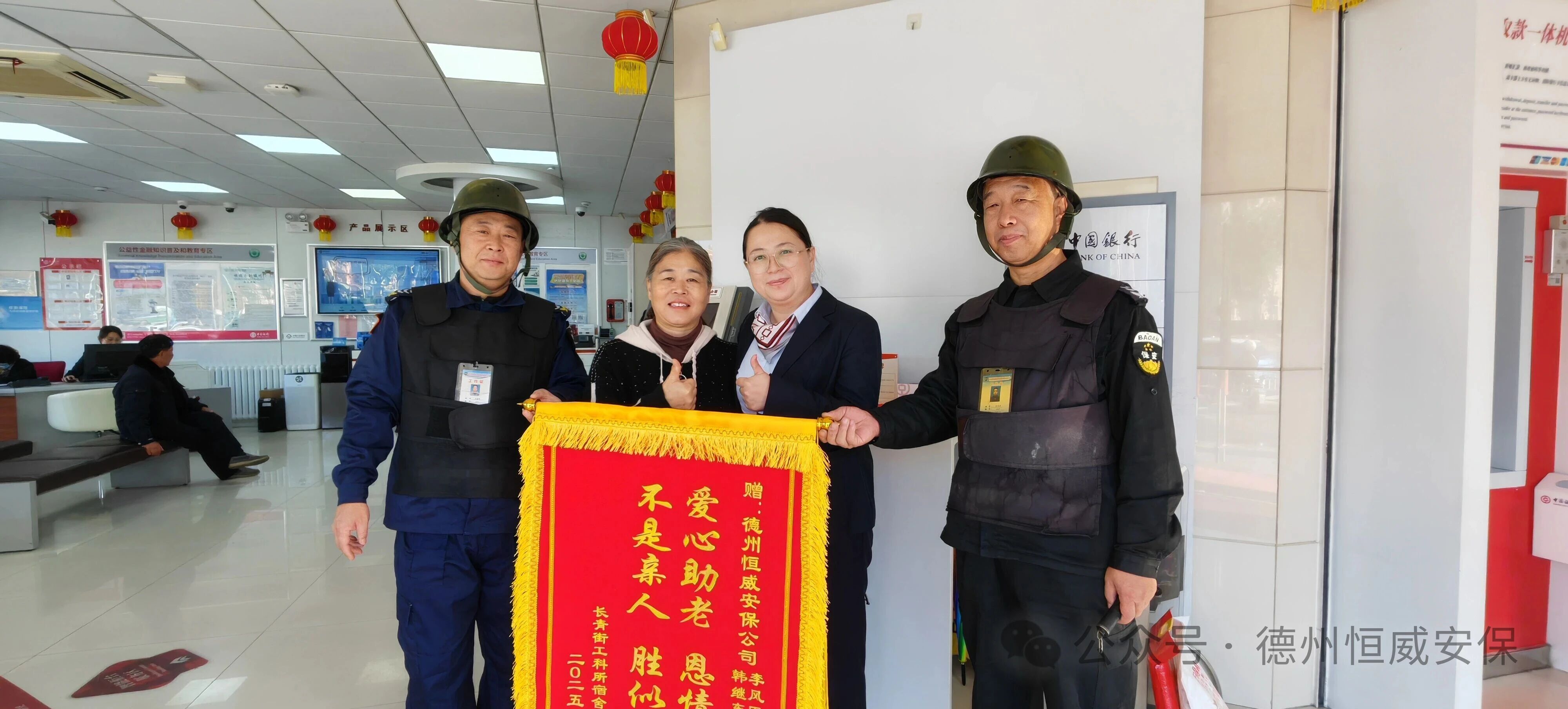 近日,家住長青街工科所宿舍的張女士專程來到中國銀行新湖支行網點,將一面印有“愛心助老,恩情難忘,不是親人,勝似親人”的錦旗交到駐點保安員李風臣和韓繼東手中,以此感謝他們對家中八旬母親的及時救助與溫情守護。