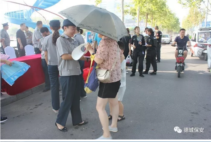 本次活動分為:展板宣傳、發放宣傳資料、向市民講解活動目的及保安行業發展等;其次全體保安員在廣場進行宣誓儀式;烈日炎炎下,保安員神情凝重,緊握拳頭,對來接受宣誓的領導莊重宣誓。宣誓中,每位保安員對自己肩負的神圣職責和光榮使命作出鄭重的承諾和讓,樹立起我是保安員我光榮,我是保安員我驕傲的思想。并時刻牢記我們是衛士,要用一顆赤誠的心維護駐點單位的安全和健康。第三通過各種媒體如微信公眾平臺、微信群、網絡、報刊等進行宣傳,向社會各界展現保安行業發展成就、保安員突出事跡、開展安全知識普及教育等亮點工程。