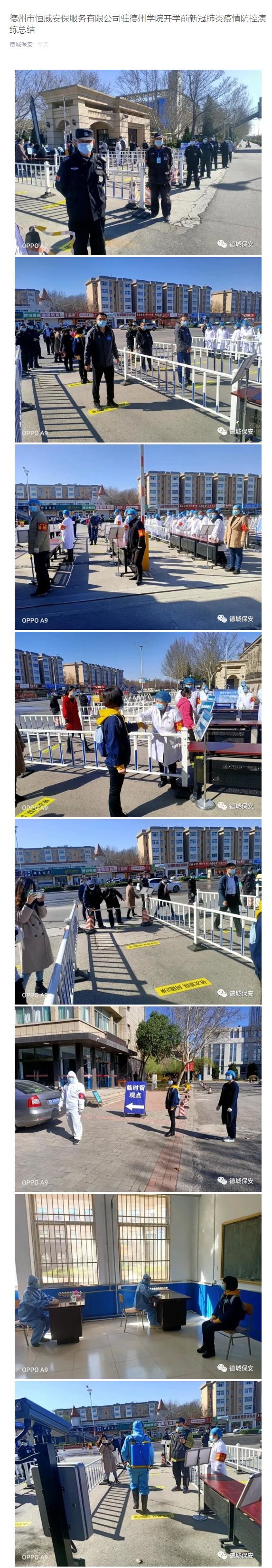 為進一步規(guī)范校園新冠肺炎疫情防控工作,提升學(xué)校應(yīng)對突發(fā)疫情的應(yīng)急指揮能力和組織協(xié)調(diào)能力,切實保障師生的健康安全,根據(jù)相關(guān)文件要求,3月19日上午,德州市恒威安保服務(wù)有限公司駐德州學(xué)院安保部門與校方組織舉行新冠肺炎防控應(yīng)急模擬演練。具體情況如下: